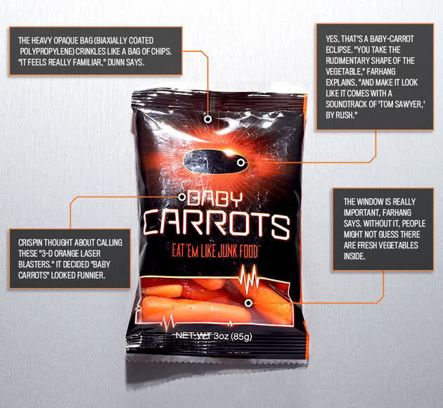 A répatermelők ezzel a stratégiai megoldással teljesen új értelmet adtak a répának, kihasználták a snackek kreálta divatot és lehetőségeket. Úgy látszik a bébirépa lehet olyan népszerű a megfelelő marketinggel és csomagolással, mint a chips?!
